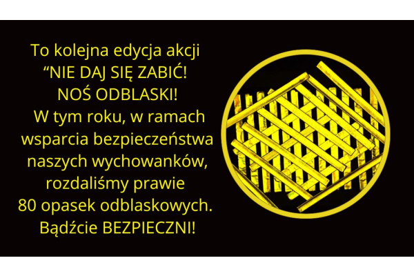 W tym roku w ramach zwiększenia bezpieczeństwa naszych wychowanków odbyły się zajęcia uświadamiające ważność i potrzebę noszenia odblasków. Każdy powinien być widoczny na drodze, w szczególności w okresie jesienno - zimowym. Mała opaska może uratować komuś życie. Zostało rozdanych prawie 80 opasek odblaskowych. Uważajcie na siebie i bądźcie bezpieczni!